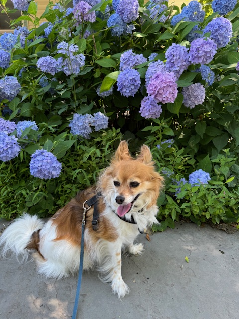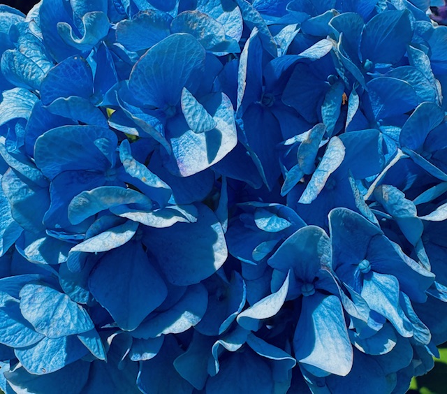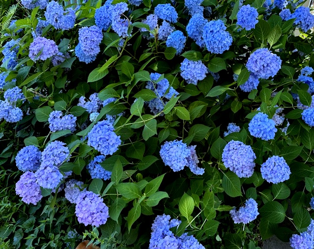 Many years ago I planted a Hydrangea in front of another house a few blocks away. It usually makes a handful of blooms each summer. But driving past it the other day I did a double-take, as it has become a massive explosion of azure and sapphire. Rudi and I took a walk over there to admire them.