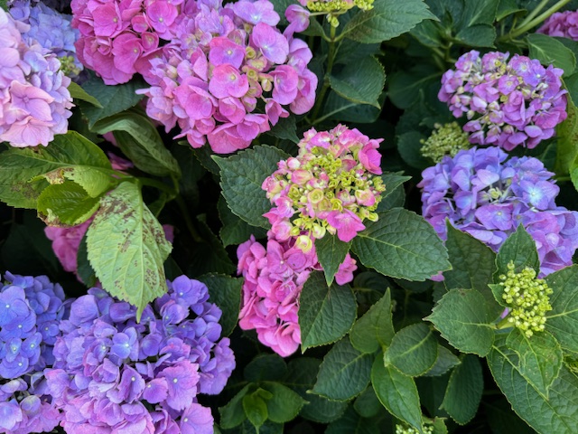 Of course I had to look up why…… apparently this is happening throughout the northeast and has something to do with the amount of rainfall combined with a milder-than-usual winter, in addition to some strong sunny days. Aside from the variety, the acidity of the soil factors into the shades and intensity of pinks or blues.