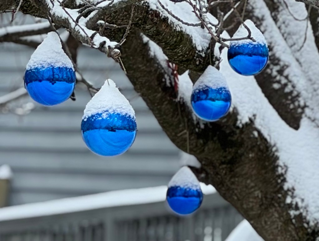Cobalt blue orbs left over from a neighbor’s holiday decor glow beneath pointed white caps.