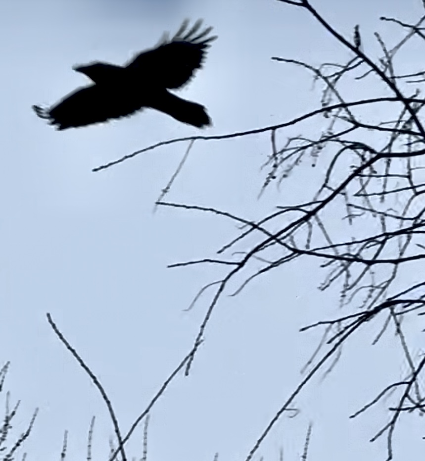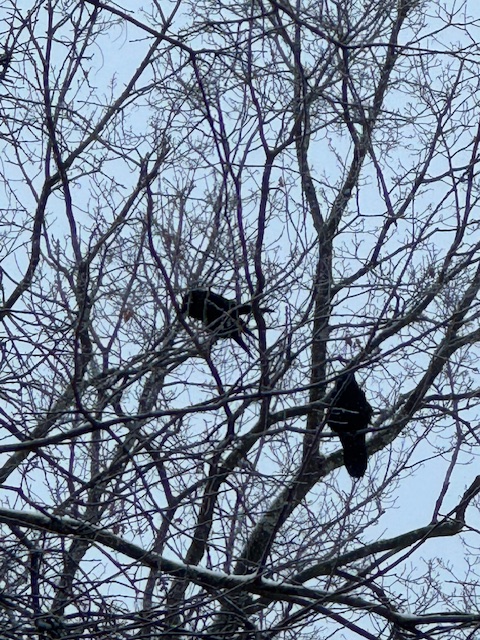 Loud croaks from above direct focus to a pair of massive Ravens in the trees behind the house.