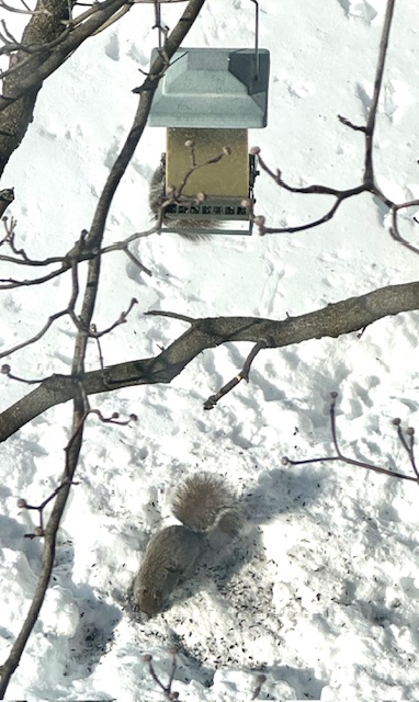 As always, when everything starts to feel like a slow slide into the abyss, it helps to look to the outside. From an upstairs window, a pair of squirrels are working in tandem on the feeder below, one perched on top swaying it back and forth while the other cleans up the spillage.