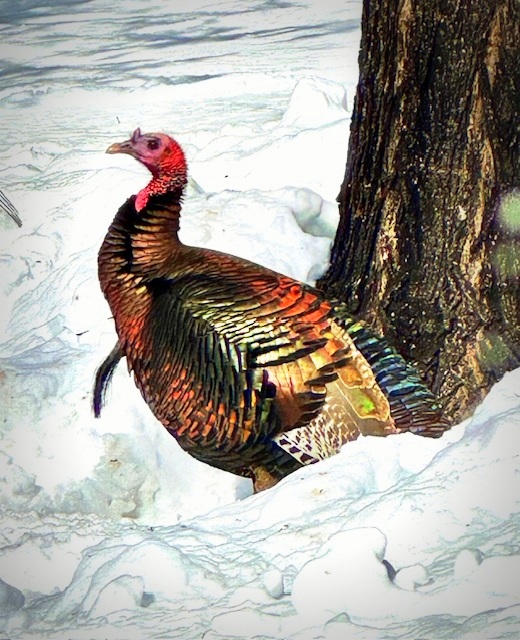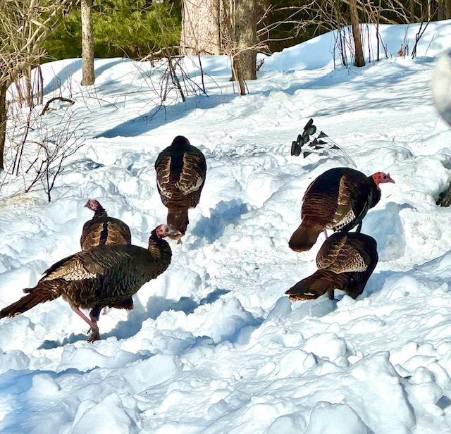 While eating quiche and soup with a friend, I’ve enjoyed the spectacle of enormous, copper-colored turkeys grazing beneath the birdfeeders.