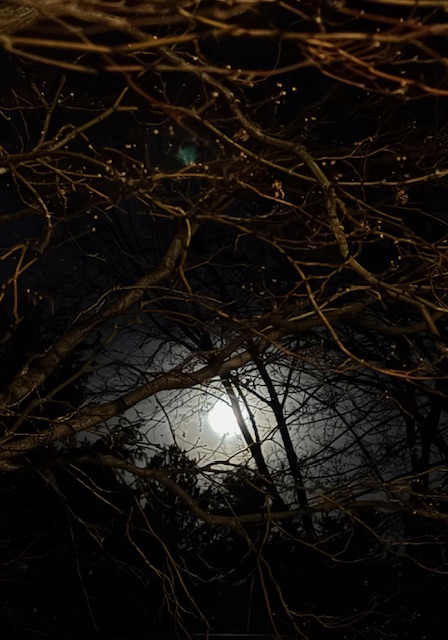 The full Snow Moon rises, a glowing eye-beacon observing the landscape beyond a tangle of branches.