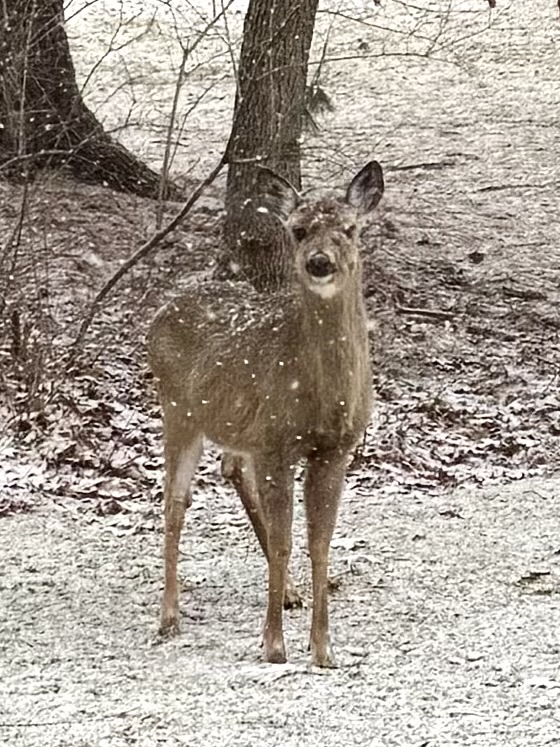 Backtracking a little now – March spit some snow here and there. This white tailed doe in the yard stood catching what will hopefully be the last of the snowflakes for a while. She will be losing her winter coat soon.