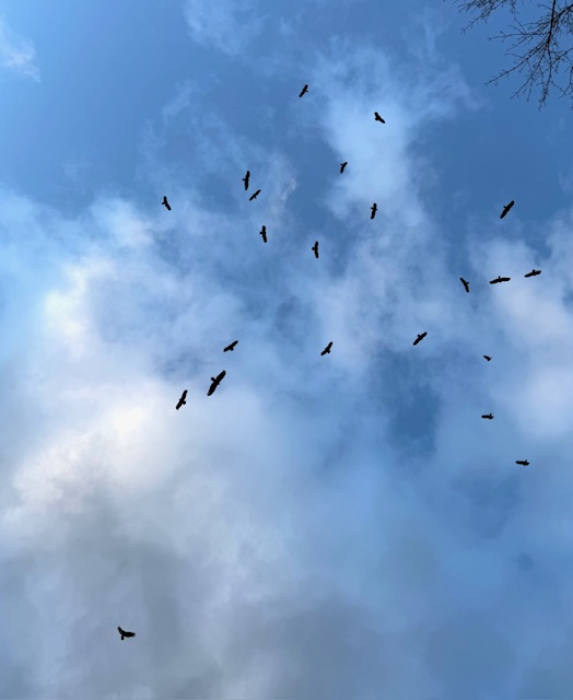 A kettle of Turkey Vultures whirl and rotate against the early evening sky. At first I thought they might have found a significant edible cache, but they were merely migrating as they rode the thermals above and across the neighborhood, over the house and out of sight.