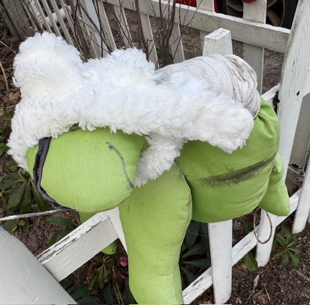 March mostly went out like the proverbial lamb. To illustrate that, the neighbors with the Fence Dinosaur (for those who follow) took off its lion costume and added a fleecy lamb’s hat.