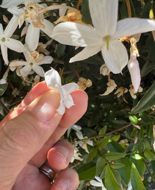 Jasmine so ecstatically fragrant that I crushed a few blossoms and carried them around to intermittently inhale.