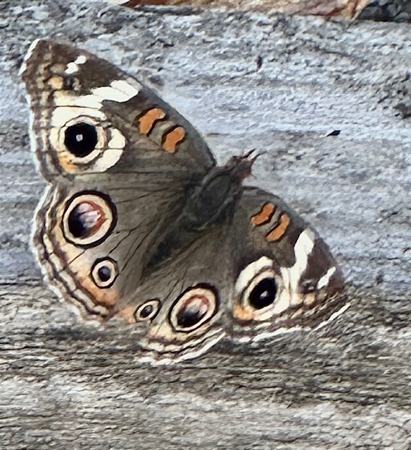 A Buckeye butterfly briefly alights near a perennial border. Mule deer grazed in the fields beyond.