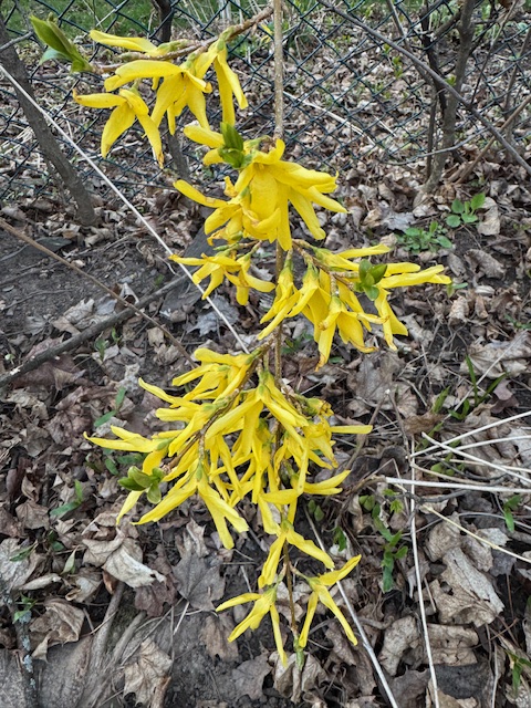 In the mere few days while I was away the Forsythia bloomed. There is only the tiniest twig of it in the back yard – I have no idea where it came from.