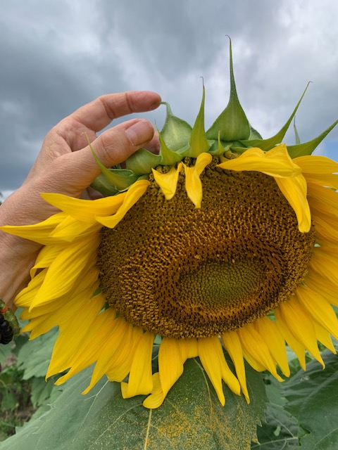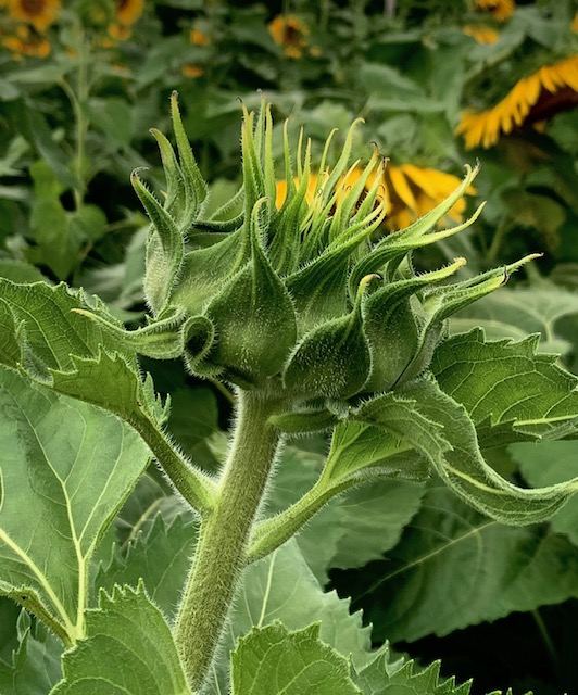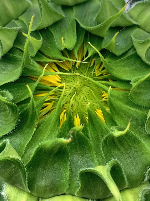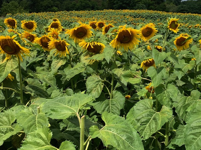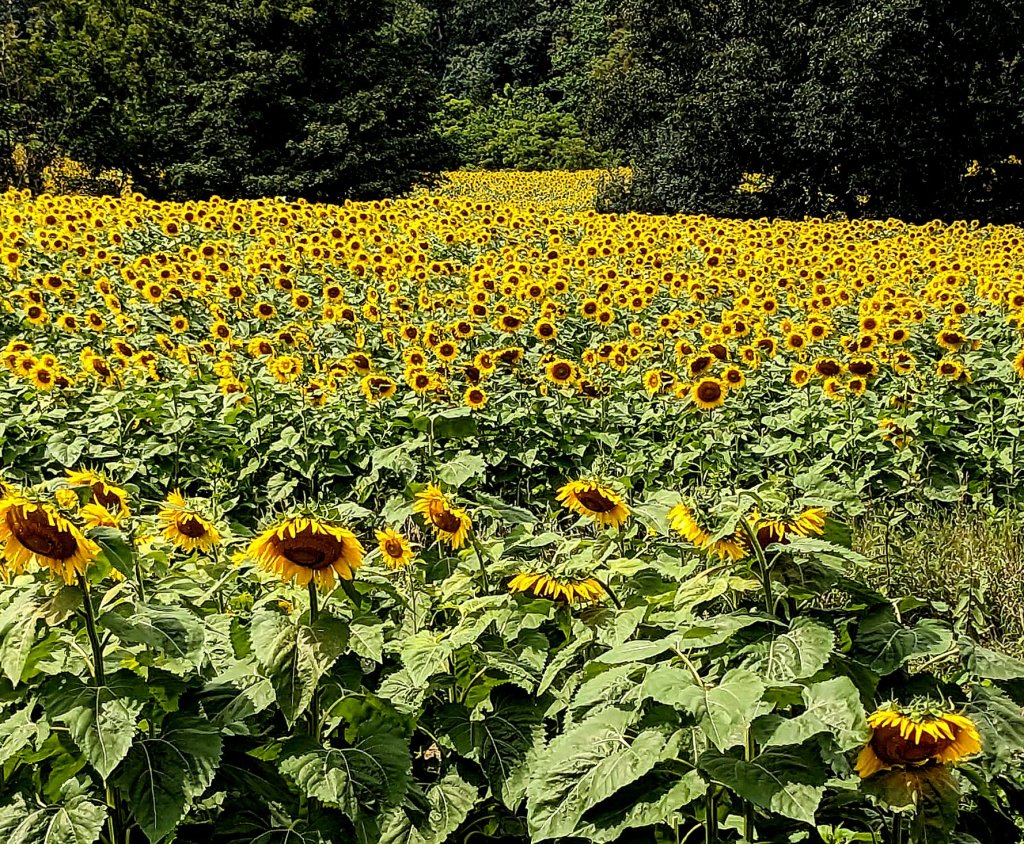 In the cultivated fields, golden sunflowers nod their heads and dot the landscape with dark eyes, their fractal faces bending toward the light.