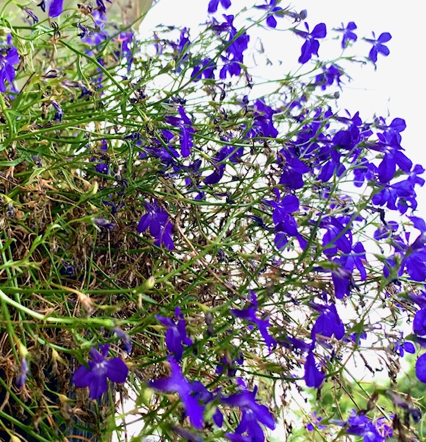 These light-hearted petunias were lush and happy a few weeks ago, but the heat of west-facing afternoons is taking its toll on them now.