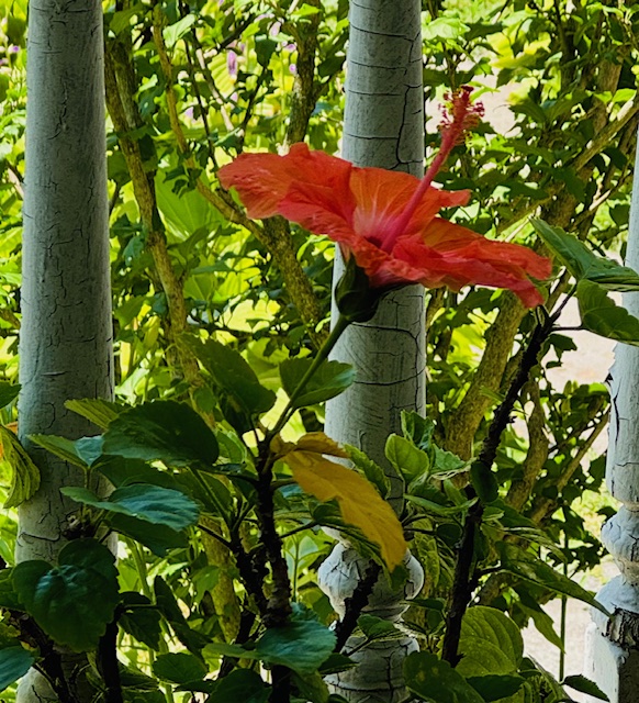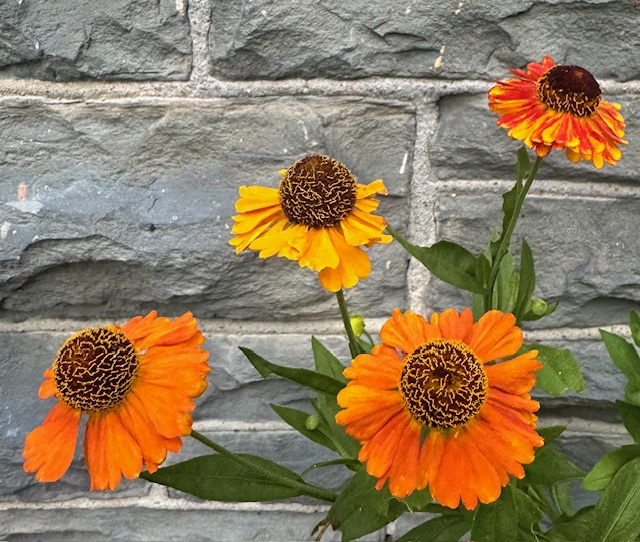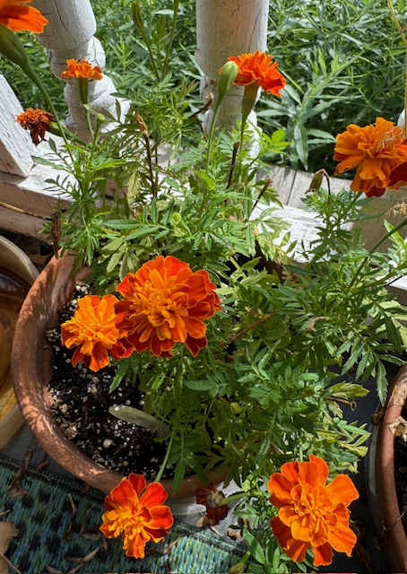 Potted plants on The Urban Porch reflect The Oranges of Summer too. An occasional Hibiscus flower will bloom for a day.