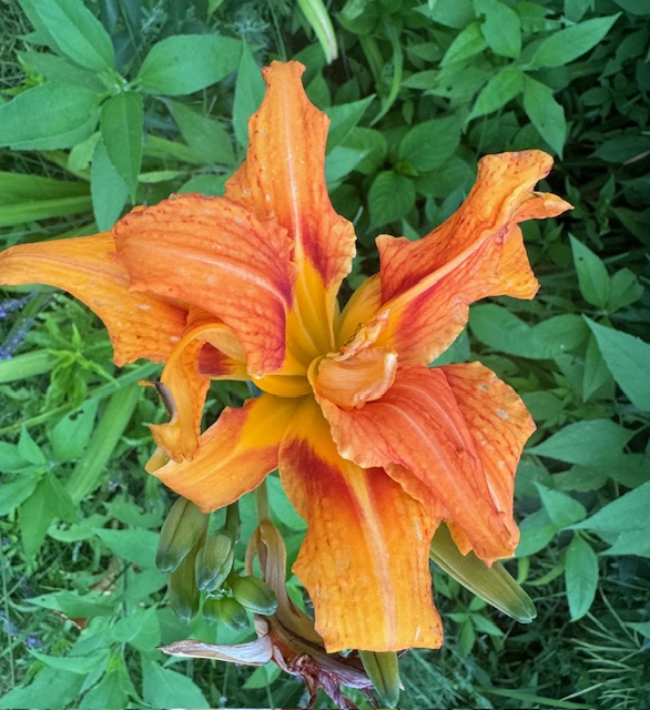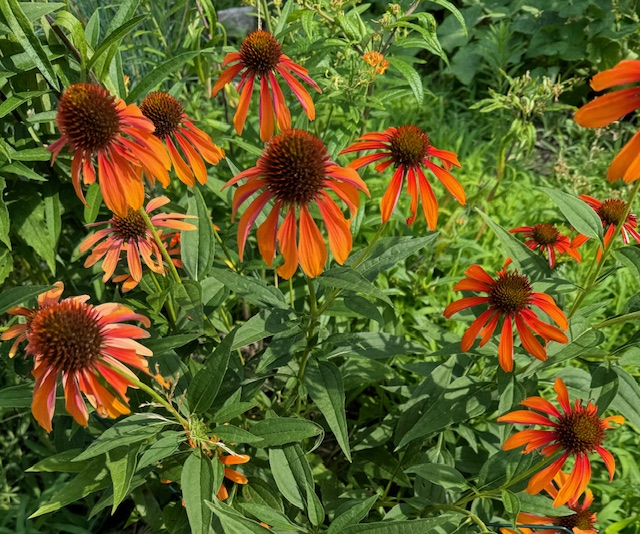 Mere steps away in a neighbor’s front yard, a variety of vibrant orange Coneflower draws the eye. I have the mauve ones – perhaps these are a possibility for next year….