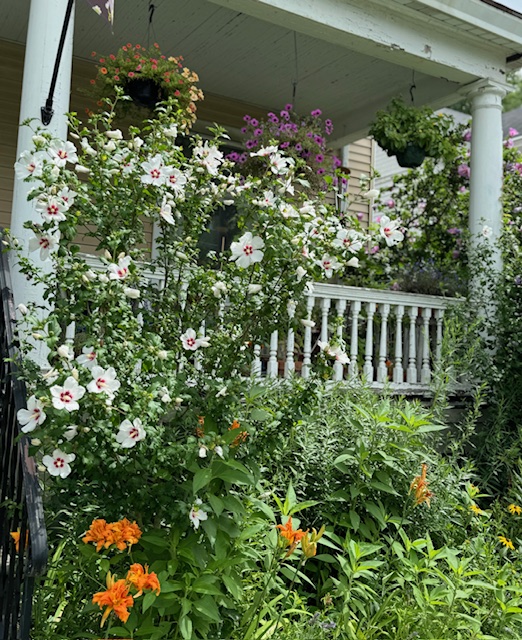 Well into July now, the weather is hot and steamy and the neighborhood is a-pop with the next phase of color and bloom. With just the tiniest bit of guilt, I note the tidily tended perennial beds of the house next door; weed-free and thoroughly mulched. I have allowed the plant life to run rampant in this yard – it has been difficult to distinguish what is a weed and what is not at this point. The growth on and around The Urban Porch hovers in limbo phase, no longer well kept, but not yet gone to hell. There is a shabby wildness I am rather enjoying. No doubt, as the month wears on it will all tip over into a disheveled mess, but for now the random bursts of color are somewhat delightful.
