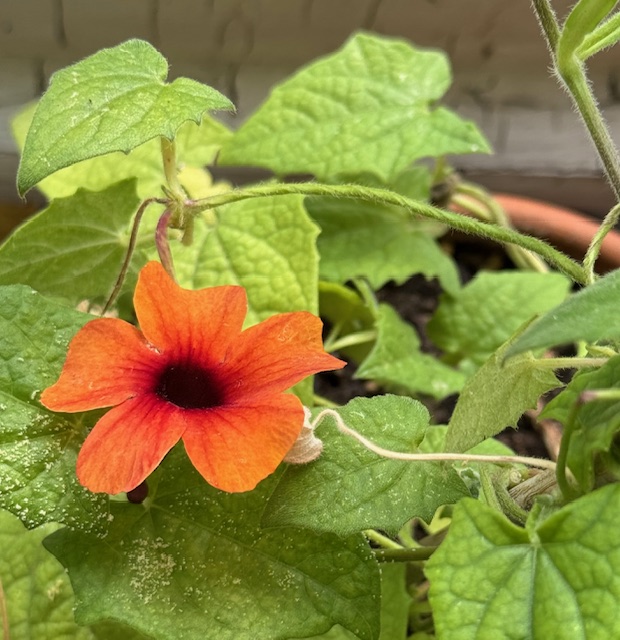The Black-eyed Susan Vine sends tendrils out to the railing.
