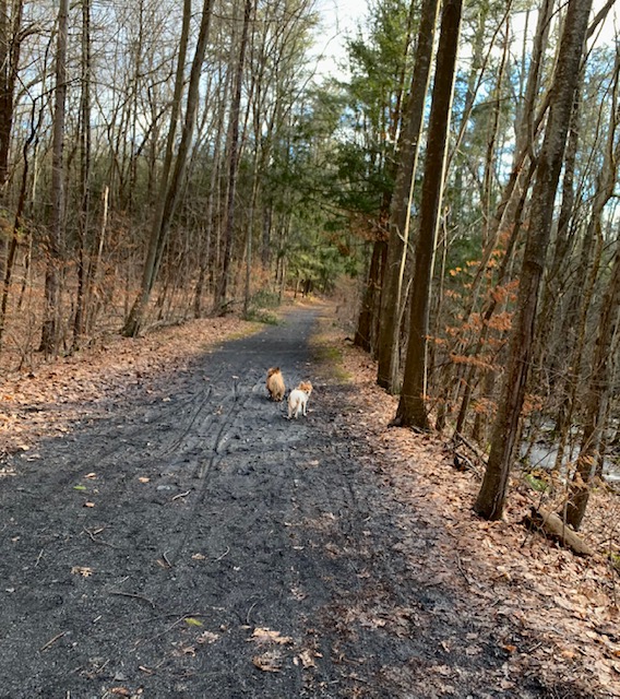 The ginkgo trees are in full lemon-yellow display. I love ginkgo leaves with their beautiful fan shape. They make lovely patterns on the ground. The crushed ginkgo seeds, or “ginkgo nuts” of the female trees smell really bad (actually like vomit). There is one area of the sidewalk down the street that is littered with those smelly things every year. I have read that the seeds contain a toxin that can sicken a dog. Rudi did not eat any of these, but it’s good information to know.